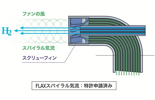 フレアーは、そんな水素を丸ごと空気で包みこみ、水素エアー(スパイラル気流)として飛ばすことに成功しました。これにより、従来の⽔素ガス発⽣器のような、吸引のためチューブを⿐に装着することは不要になります。