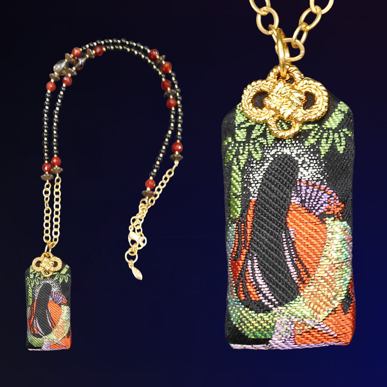 御守りは本来首にかけて身に着けるとより良い神様パワーが得られるといわれています。ファッション的にも違和感ないように小さめのお守り袋は細かい刺繍でデザインされ、そこに天然石を合わせおりファッショナブルに仕上げました